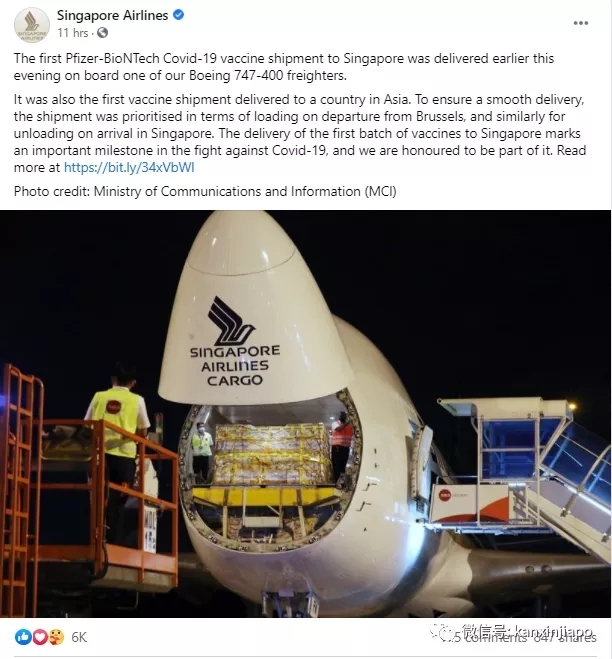 亚洲首批辉瑞疫苗12月21日运抵新加坡,负责运送疫苗的是新航一架波音747-400型货机,航班号SQ7979,从比利时布鲁塞尔飞抵新加坡。新航指出,在布鲁塞尔机场,疫苗优先被安排放入机舱,抵达樟宜机场时也按照同样的程序优先卸下。之后,疫苗被送往新翔集团的冷链设施储存。飞机在停机坪停下后,机头缓缓开启,机舱内就是装着疫苗的31个温控箱。本次负责物流的是敦豪(DHL)。敦豪表示,疫苗在保安人员的护送下从比利时的制药厂送到机场,然后运抵新加坡;温控箱设有温度器和全球定位系统,以方便工作人员全程监控。